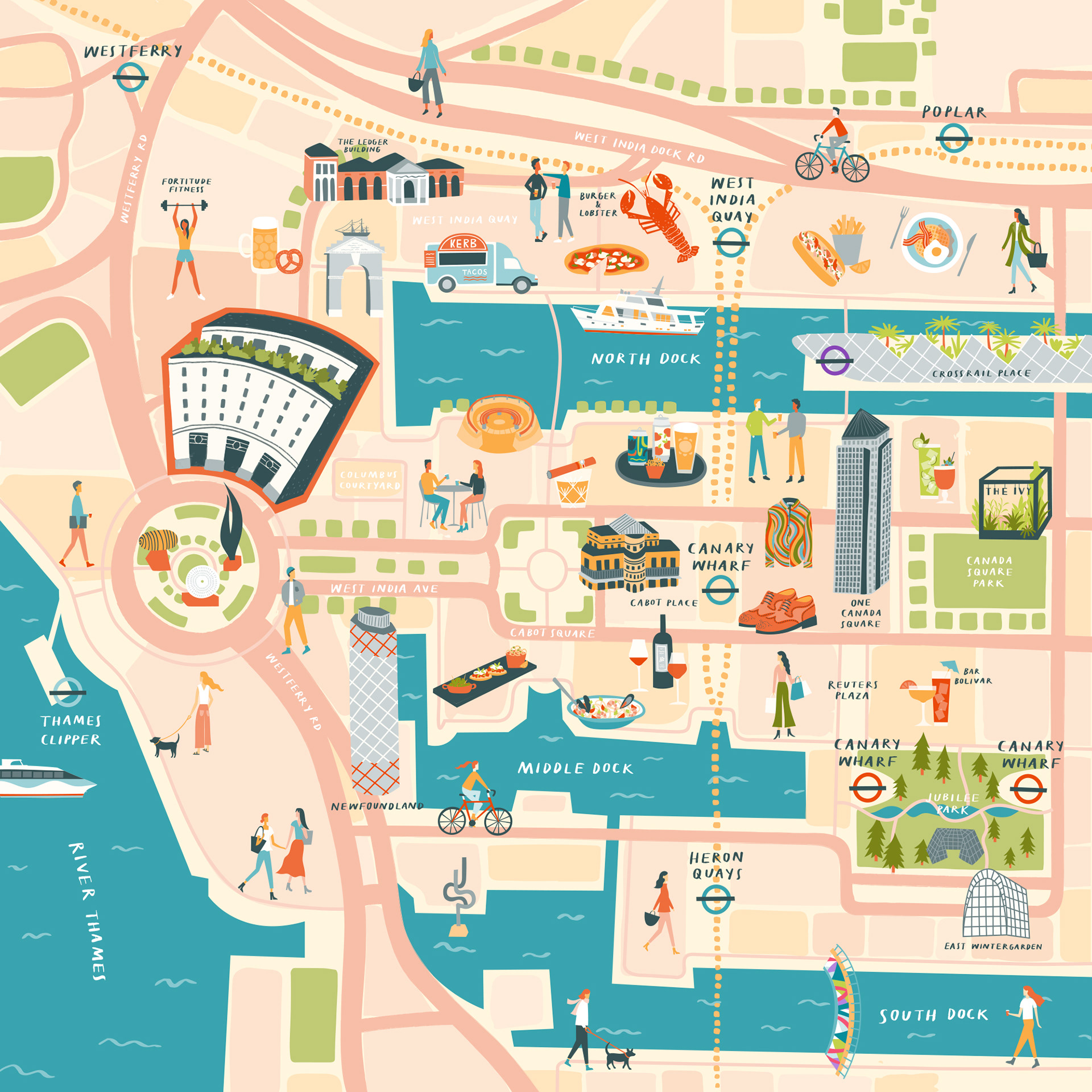 An illustrated map highlighting food, drink & retail in Canary Wharf.